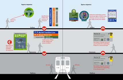This diagram shows the staged information release system of the Ride!Philadelphia Portals Project for both ingress and egress sequences. Integrerated with the Walk!Philadelphia program, the informed transit user can seam-lessly become an informed pedestrian.