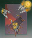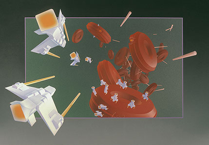 One of Centocor’s founders imagined a broad range of medical functions for monoclonal anti- bodies, among them neutralizing the fatal effects of septic shock (left) and visualizing the extent and severity of heart attacks (below). For Centocor’s 1986 annual report, Katz Wheeler developed illustrations of these applications, using a Star Wars metaphor.