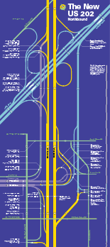 Since the 1980s, JKDA has developed heads-up maps for PennDOT. If the direction the user is facing is at the top of the map, right on the map is right on the road, and the type is still right-side up. This map shows the final form of a multi-year enhancement of US 202, and is 8" x 36" unfolded. Below is a detail showing how blended color is used to indicate transitions between different types of roads.