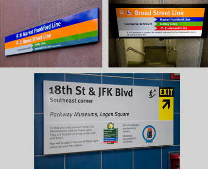 For exiting passengers a sign at the foot of every stair references the street corner, nearby attra- ctions, and a explanation of the Walk!Philadelphia pedestrian wayfinding system at grade.